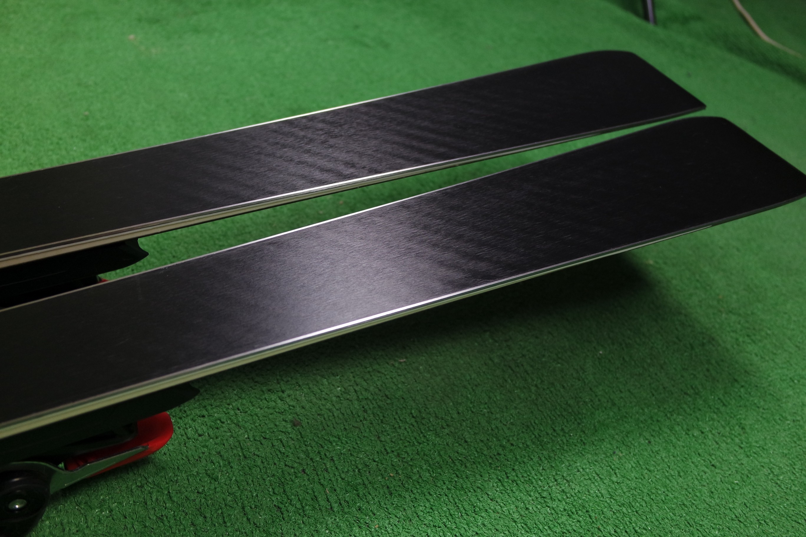 Krawędzie w nartach są grube, ślizgi równe, czyste.