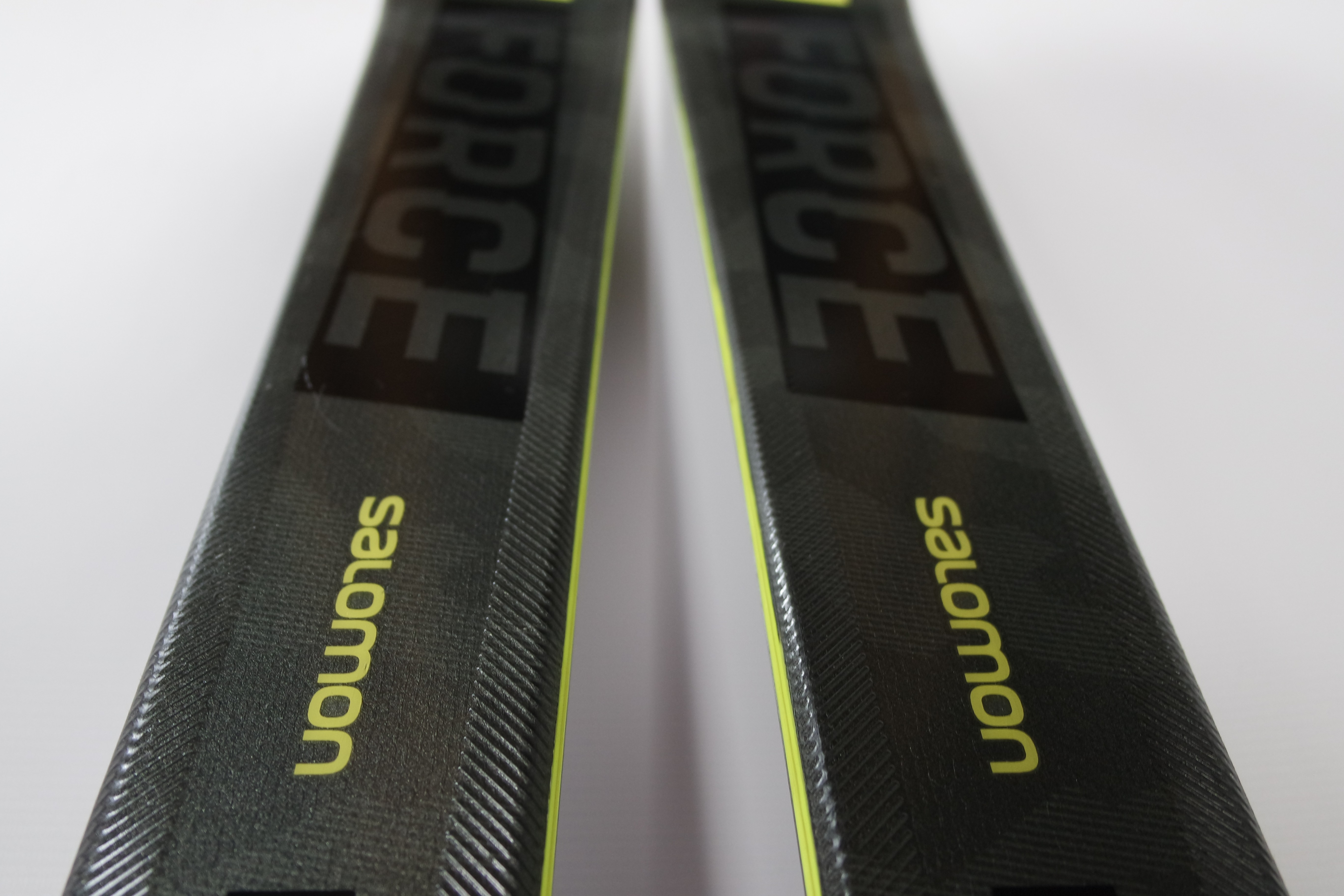 Krawędzie w nartach są grube, ślizgi równe, czyste.