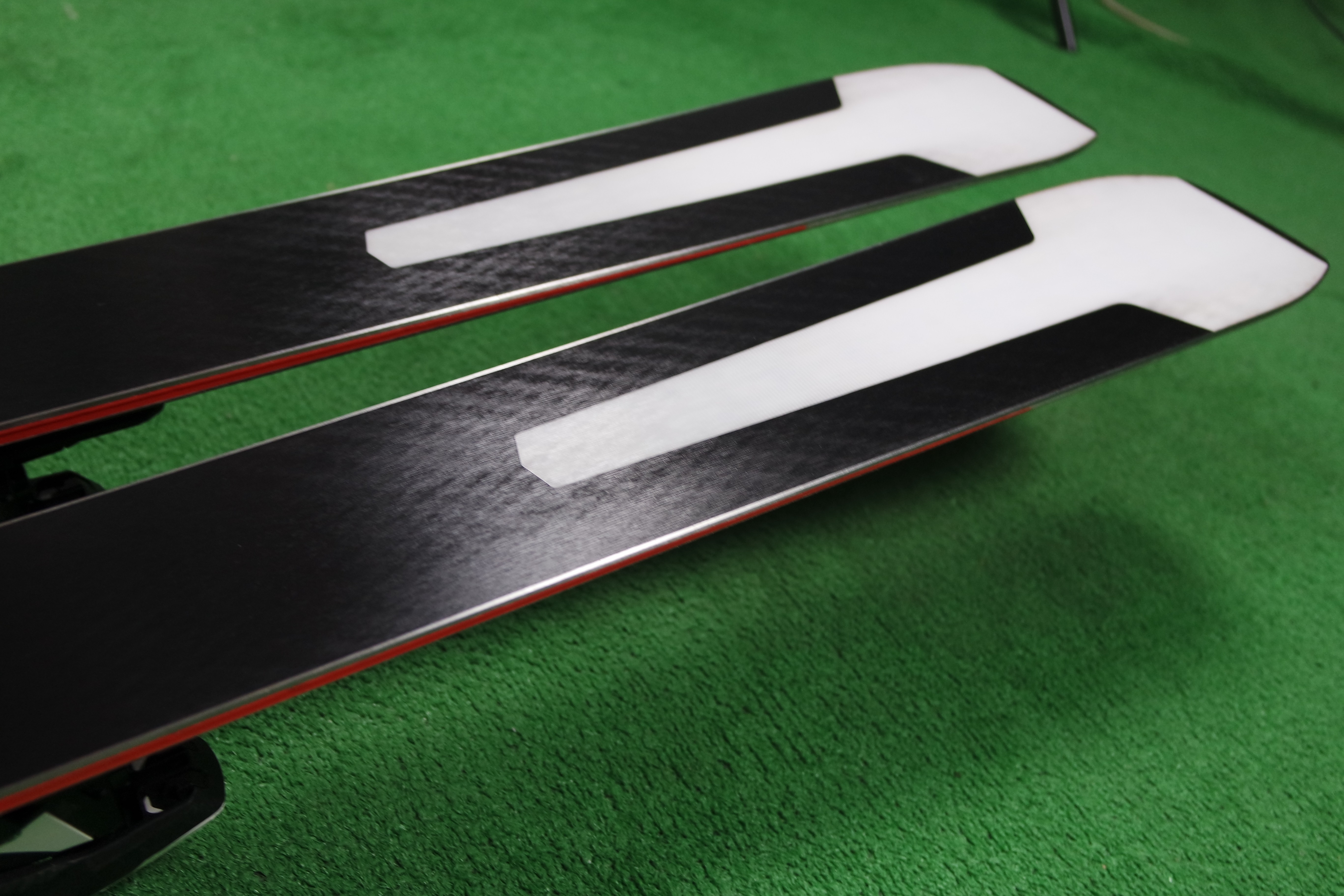 Krawędzie w nartach są grube, ślizgi równe, czyste.