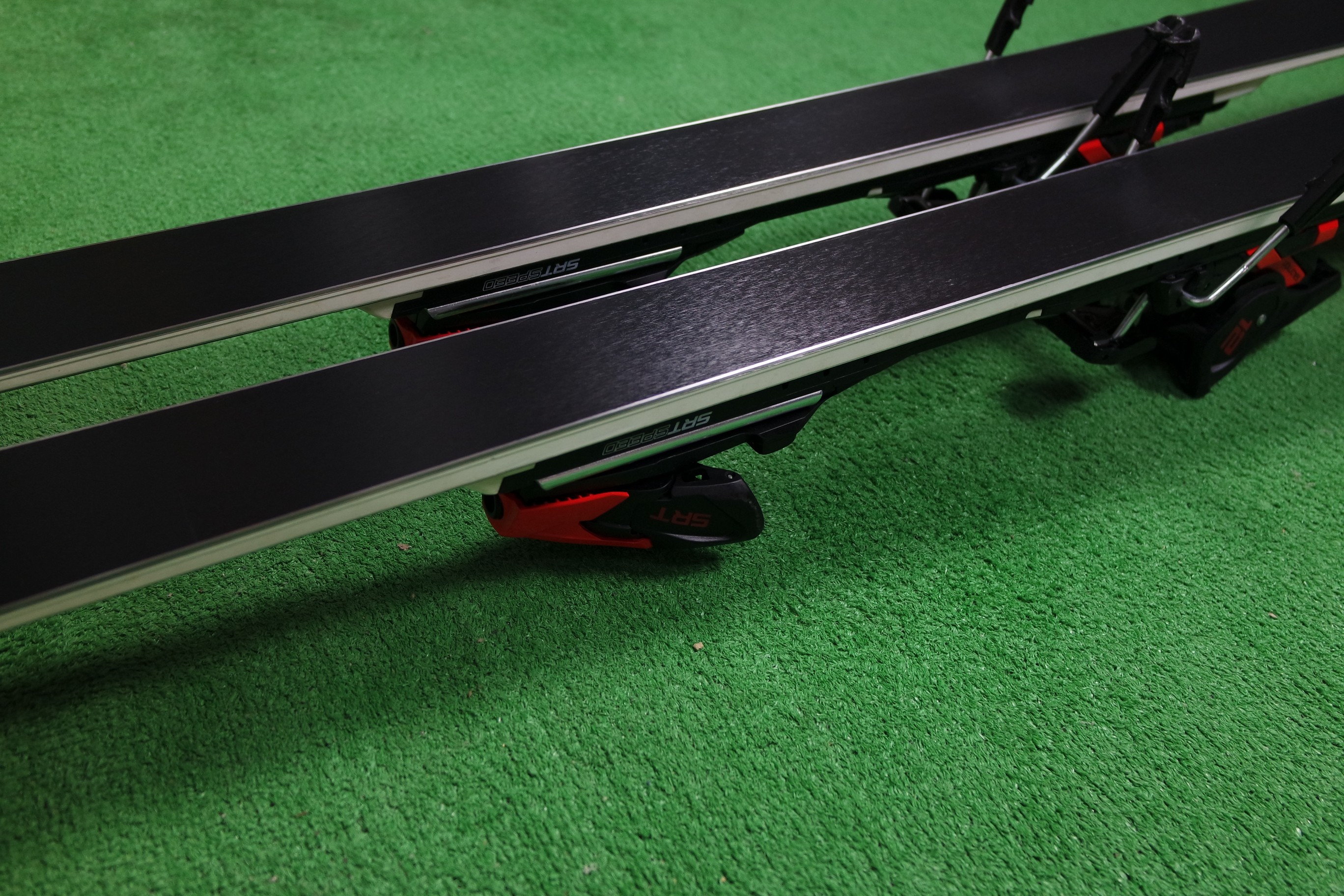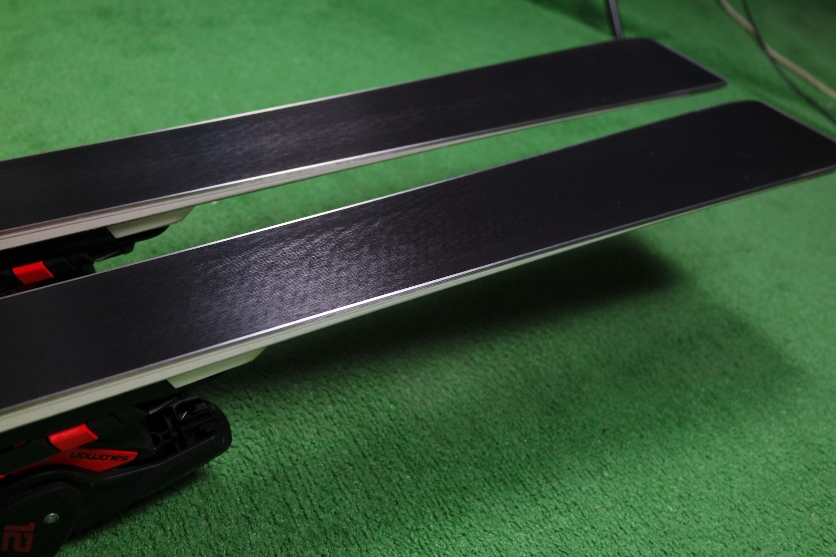 Krawędzie w nartach są grube, ślizgi równe, czyste.