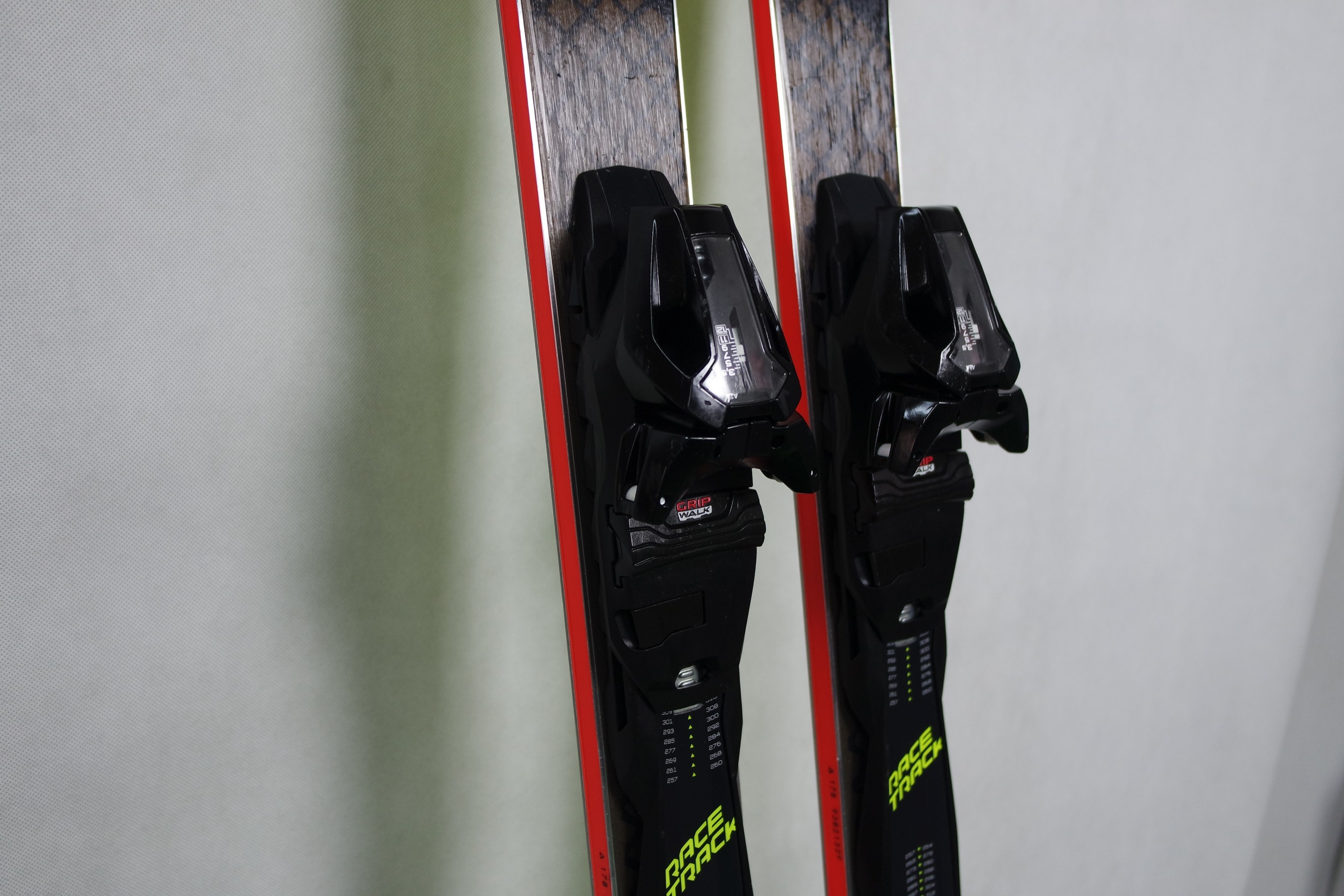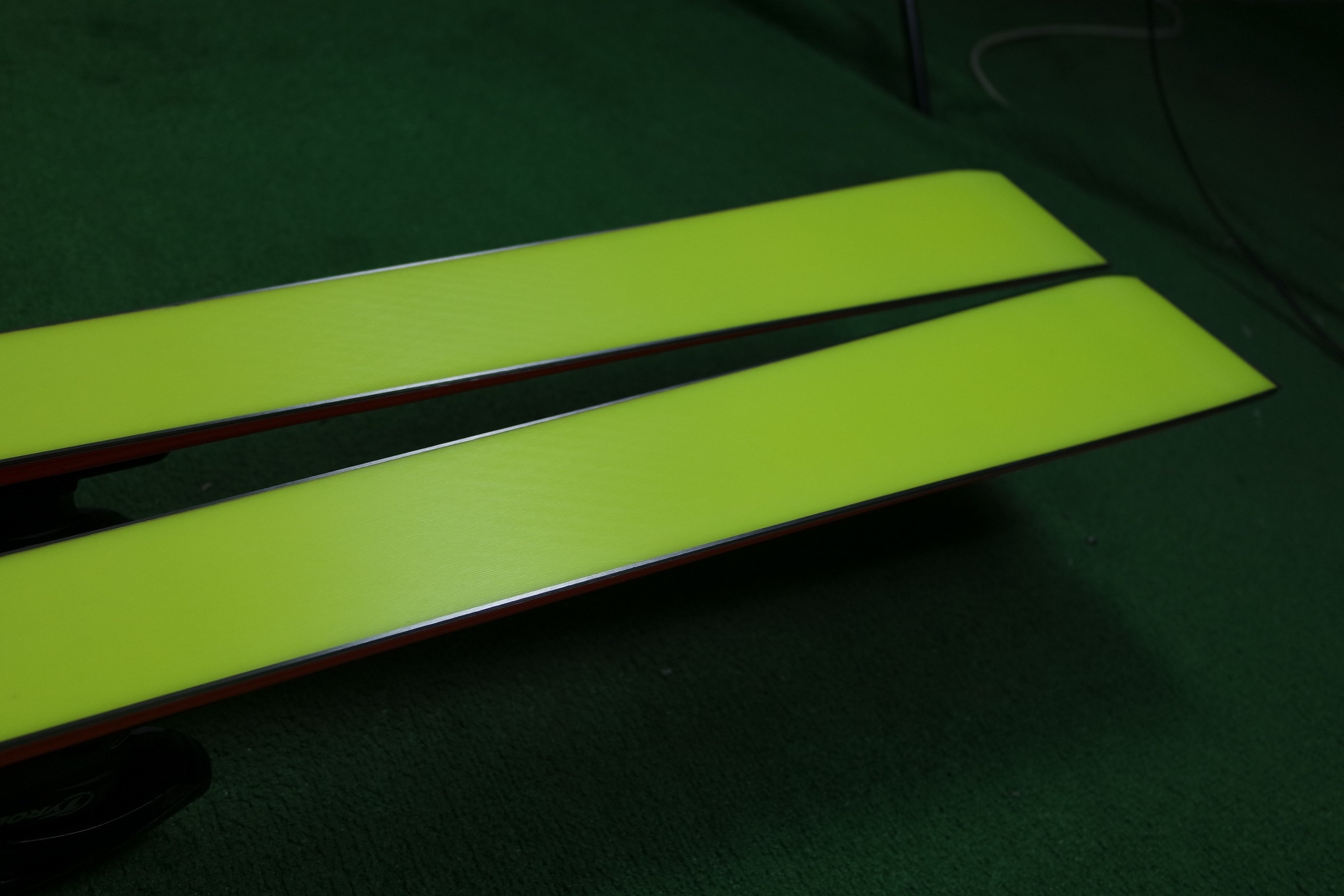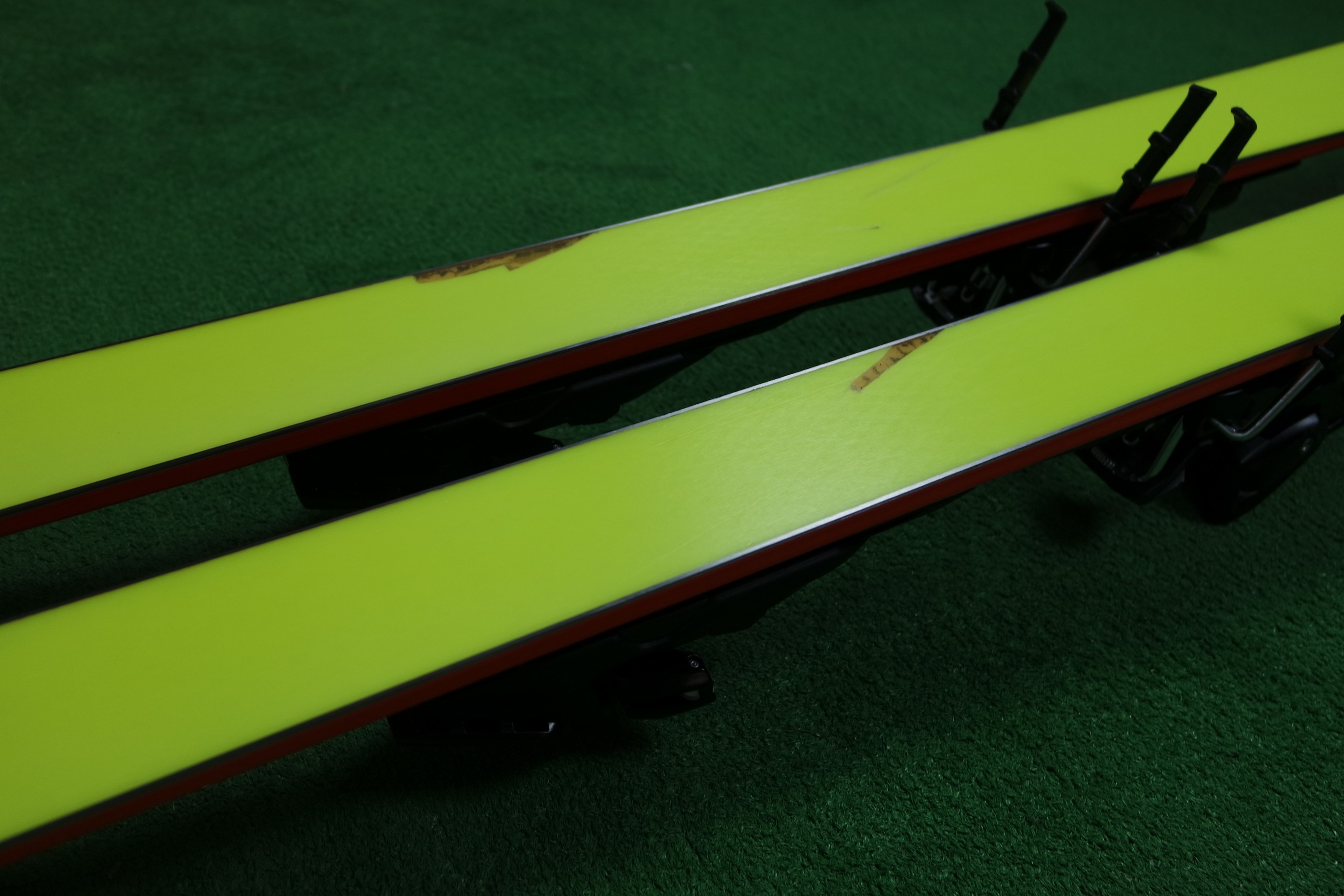 Krawędzie w nartach są grube, ślizgi równe, czyste.