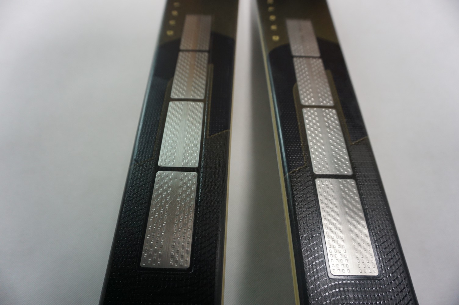 Krawędzie w nartach są grube, ślizgi równe, czyste.