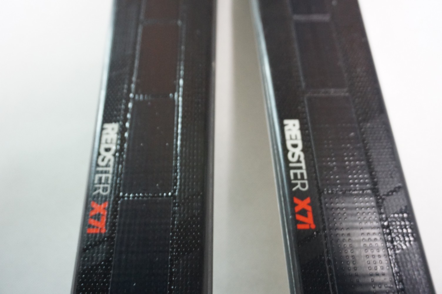 Krawędzie w nartach są grube, ślizgi równe, czyste.
